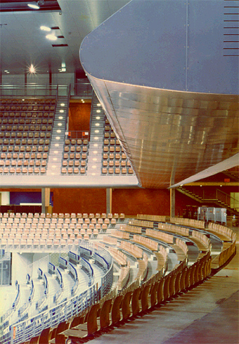 Gesamtabmessungen von 108 x 86 m überspannt. Haupttragglieder sind fischbauchförmige Fachwerkbinder mit 68,6 m Stützweite im Regelabstand von 7,5 m. Die Systemhöhe folgt der Beanspruchung und beträgt 2 m über den Stützen und 4,5 m in Feldmitte. Die Bindergurte bestehen aus 40 bzw. 60 cm hohen geschweißten I-Profilen. In den Mantelnutzungen der Max-Schmeling-Halle sind drei Dreifach - Sporthallen mit insgesamt 9 Kleinfeldhallen durch Trennvorhänge unterteilt. Durch Integration in den Hallenkomplex konnte eine Dreifach - Sporthalle für ca. 7 Millionen DM inclusive Sportgeräte hergestellt werden. |