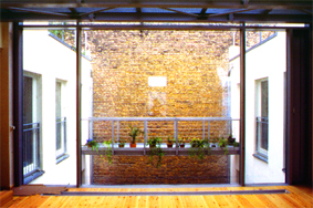 Straßenseitig wurden Glasgaupen in regelmäßigen Abständen angeordnet. Nach Süden öffnet sich das Dach mithilfe einer über die gesamte Gebäudebreite reichenden Glasfassade. In den OG's befinden sich Maisonette- und Geschoßwohnungen. Das EG wird weiterhin gewerblich genutzt.